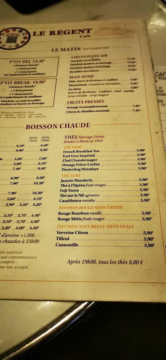 Introducing the menu at LE REGENT Cafe: Nestled in the heart of Bordeaux, at 52 Cr du Chapeau-Rouge, LE REGENT Cafe boasts a captivating outdoor seating area with views of the opera, perfect for savoring delightful meals while people-watching. The menu features classic French delicacies, such as the renowned croissant and Tartare de Boeuf, both praised for their delicious flavors. Customers rave about the swift and attentive service, facilitated by a multilingual and friendly staff. For breakfast, the Petit Dejeuner is a favorite, featuring an omelette paired with fresh coffee. The charming ambiance, highlighted by comfortable seating and a lively atmosphere, complements each visit. While dishes like the extravagant hotdog provide a playful touch, the classics are where LE REGENT shines. Indulging in a pear tart here is not just a meal; it’s an experience to treasure amidst the enchanting streets of Bordeaux.